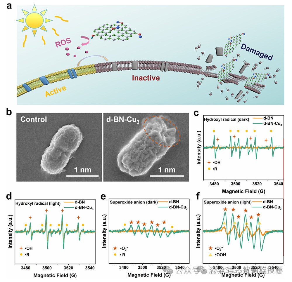 图3. (a) d-BN-Cu 的抗菌机制示意图;(b) 扫描电子显微镜(SEM)下,经抗菌材料处理前后的大肠杆菌形态;(c、d) 电子顺磁共振(EPR)分析 d-BN-Cu 在光照和无光照条件下的 ROS 生成情况,显示光照下羟基自由基(・OH)产量增强;(e、f) EPR 测试 d-BN-Cu₃在光照和无光照条件下对超氧阴离子(・O₂⁻)的催化效果。