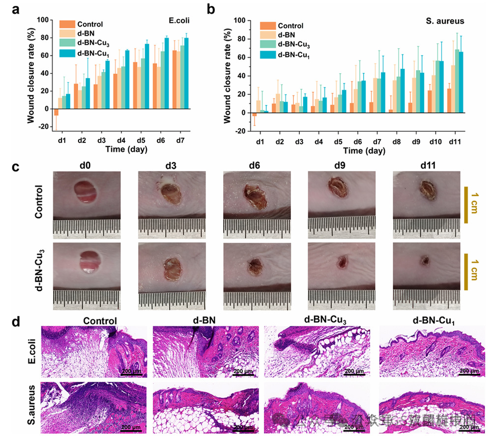 图4. 细菌感染小鼠炎症伤口愈合率统计图:(a) 大肠杆菌感染组;(b) 金黄色葡萄球菌感染组(小鼠感染细菌 1 天后,分组接种 d-BN、d-BN-Cu₃、d-BN-Cu₁和生理盐水(对照组));(c) 金黄色葡萄球菌感染实验中,对照组和 d-BN 组的小鼠伤口图像;(d) 感染后第 3 天,每组取 1 只小鼠的伤口组织切片进行苏木精 - 伊红(H&E)染色分析。