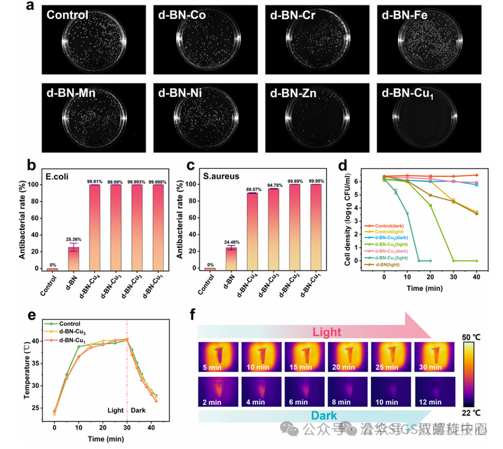 图2. (a) 通过菌落计数法评估负载不同金属离子(Co、Cr、Fe、Mn、Ni、Zn、Cu)的 d-BN 对大肠杆菌的抗菌活性,负载 Cu 的 d-BN(d-BN-Cu)表现出最强杀菌效果(菌液浓度为 10⁶ CFU・mL⁻¹,在 37℃、120 rpm 恒温摇床中培养 3 小时,培养后混合液稀释 100 倍接种计数,抗菌材料工作浓度为 100 ppm);(b) d-BN、d-BN-Cu₁、d-BN-Cu₂、d-BN-Cu₃对大肠杆菌的抗菌率;(c) 上述材料对金黄色葡萄球菌的抗菌率;(d) 模拟光照条件下(400-1076 nm,AM 1.5 G,100 mW・cm⁻²)d-BN、d-BN-Cu₃、d-BN-Cu₁对大肠杆菌的抗菌效果测试(暗处理组在室温避光条件下进行,对照组为生理盐水与菌液混合液);(e) 100 ppm 浓度下,对照组、d-BN-Cu₂和 d-BN-Cu₃在太阳模拟器下的光热效应;(f) d-BN-Cu₃在光照(50℃)和黑暗(22℃)条件下的光热时间曲线。