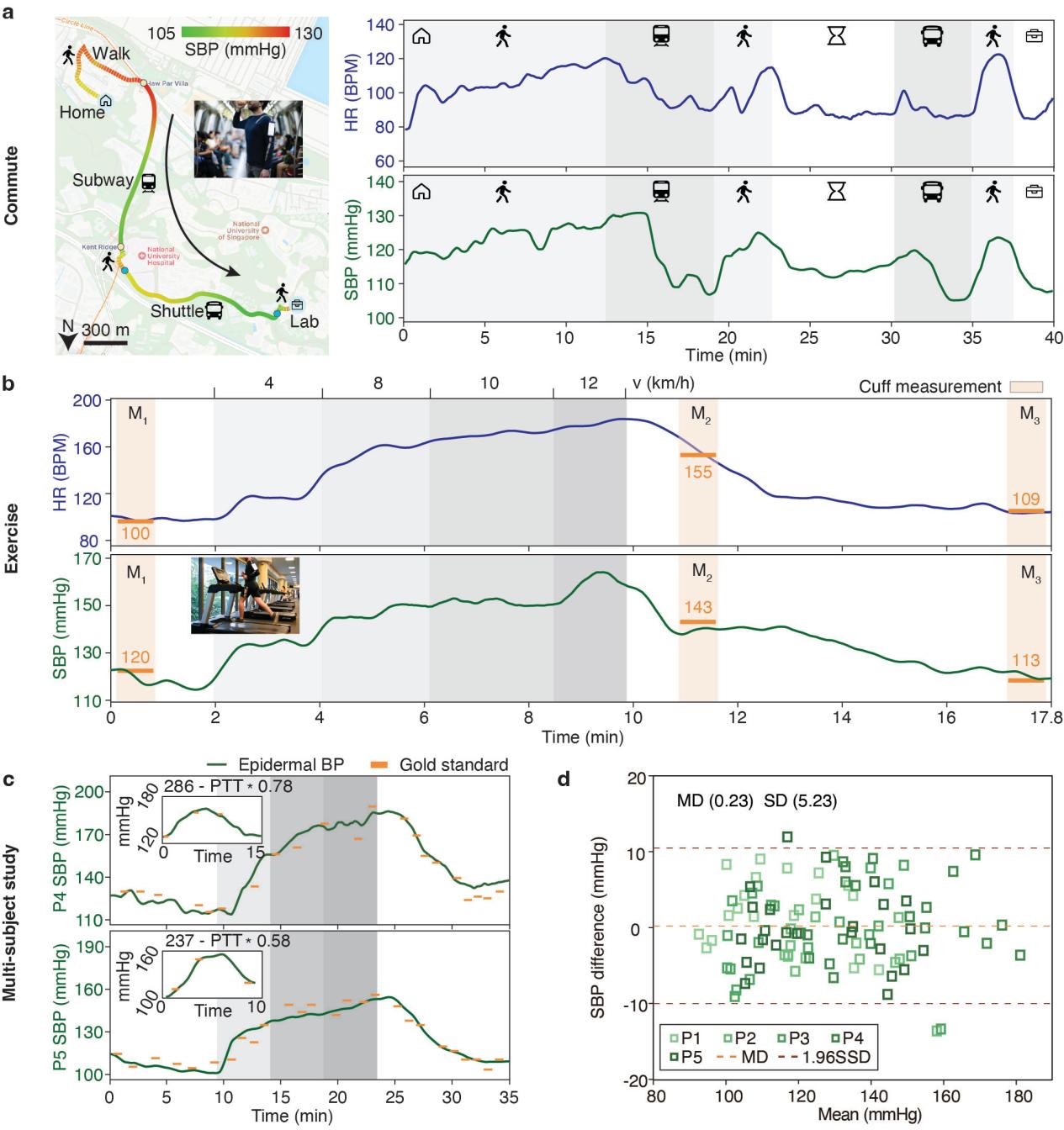 通过同步采集ECG与PPG信号并结合脉搏传导时间(PTT),该系统实现了连续收缩压估计。实验结果表明,该系统能够长期稳定地进行连续血压监测,且与标准测量结果保持良好一致性。研究团队进一步在通勤、睡眠、运动等场景中验证了系统性能。结果显示,该无线无源生理传感网络能够在真实动态环境下连续监测心率、血氧和收缩压等生理参数。