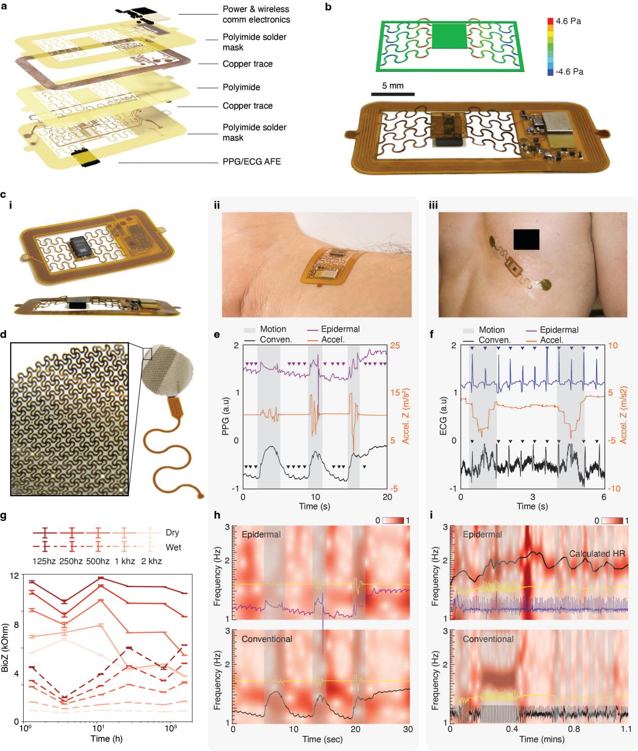 在传感器方面,研究团队设计了一系列无线无源的表皮电子传感器,构建了由心电(ECG)与光电容积脉搏波(PPG)传感器组成的系统。该系统采用无电池的柔性贴肤设计,可在运动状态下减少运动伪影、实现稳定信号采集,并兼具良好的佩戴舒适性与长期使用能力。